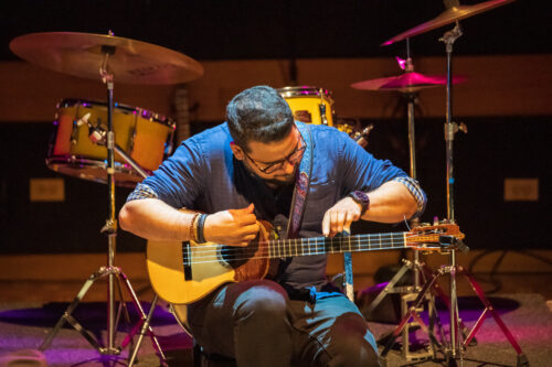“Papá Cuatro” takes as its unifying sound and symbol the four-stringed cuatro. Resembling a small classical guitar, the traditional cuatro in considered the national instrument of Venezuela. And indeed, the cast members share photos of themselves learning to play the cuatro as kids, though the percussionist jokes: “My name is Adolfo Herrera, and I am not a cuatro player. I am the cuatro’s drummer.”