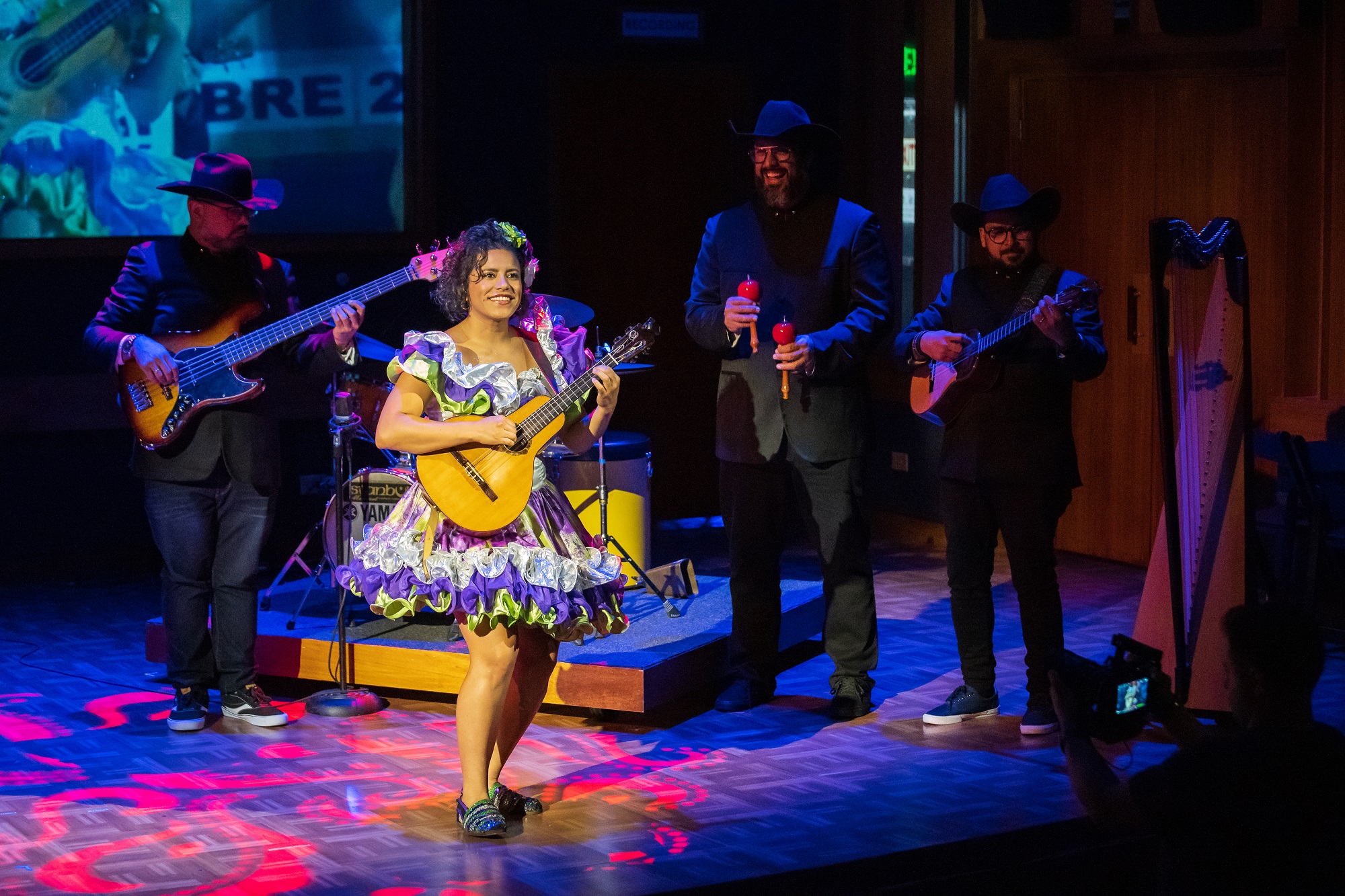 Miguel Siso, Eduardo Betancourt, Adolfo Herrera and Mafer Bandola (in booth) accompany Mariaca Semprún as she sings in “Papá Cuatro.” (Photo courtesy of Chris Crass)