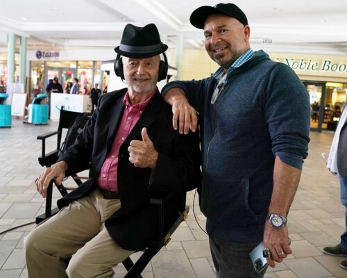 Mordecai Samel and son Marvin Samel, director and writer of “iMordecai,” during a day of shooting at the Shops at Sunset Place in South Miami. (Photo courtesy of FeMor Productions)