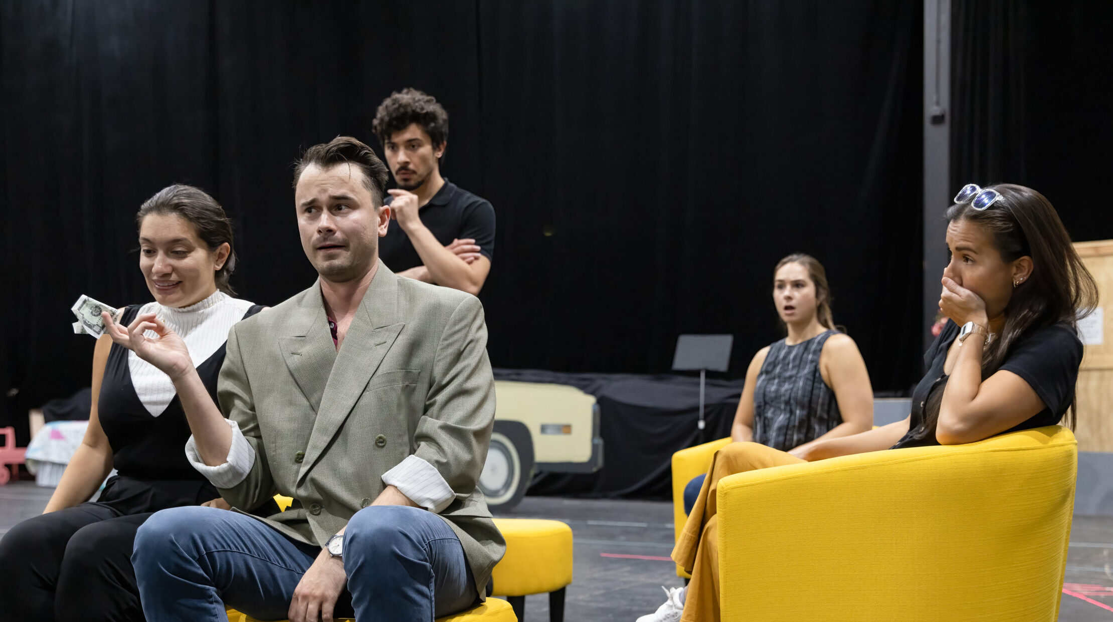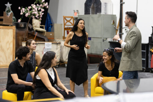 The cast of Florida Grand Opera’s “El Matrimonio Secreto” rehearses a scene. Standing is Phillip Lopez as Geronimo. Seated, from left, are Catalina Cuervo as Elisetta, Michael Pandolfo as Count Robinson, Vanessa Becerra as Carolina, and Erin Alford as Fidalma. (Photo courtesy of Eric Joannes)