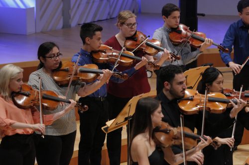 The evening’s first surprise occurred when sixteen student violists, age twelve to early college, from across South Florida joined NWS artistic director and conductor Michael Tilson Thomas and the NWS fellows onstage. With them were composer and NWS alum Nils Bultmann, Florida International University violist Michael Klotz, and former NWS alums Erik Rynearson (LA Symphony) and Madeline Sharp (Atlanta Symphony).