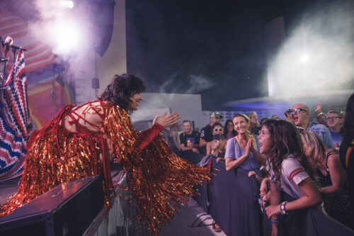 Afrobeta engages with fans during the band’s performance at the Miami Beach Bandshell in 2023, blending electronic beats with Latin-infused rhythms and theatrical flair. (Photo by OS Photography Studio)