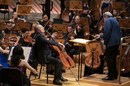 Michael Tilson Thomas at the podium conducting New World Symphony with guest cellist Yo-Yo Ma in March of 2023 at a gala in Tilson Thomas’s honor at New World Center. (Photo courtesy of Kristin Pulido, Blooming Photo Co.)