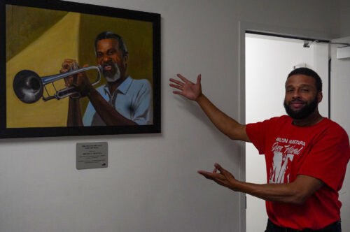 Melton Mustafa Jr. with a painting of his father Melton Mustafa Sr. “My father loved Miami. He loved South Florida, the people, the community […] he wanted to include and involve as much of the community as possible.” (Photo by Jerome Louden/JML Photo Services)