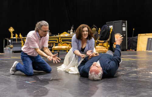 Director Jeffrey Marc Buchman in rehearsal for a scene in Act II of “Tosca” with Toni Marie Palmertree and Todd Thomas. (Photo courtesy of Eric Joannes)