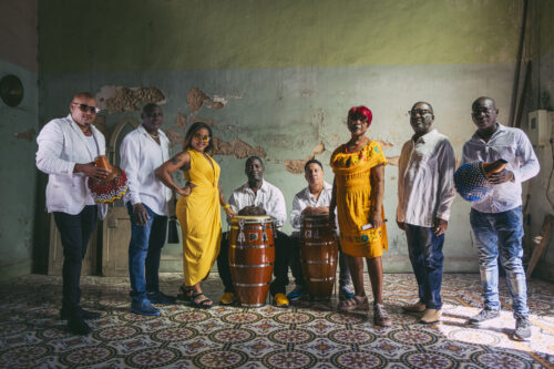 Grupo AfroCuba, from left, Andro Mella, Miguel Angel Drake (El Negro), Yaíma Pelladito, Idalberto Verrier (Puchito), Yosvany Oliver, Dolores Pérez, Laureano Alfonso (Papito),and dsu José Luis García (Pepito). (Photo courtesy of GroundUPFestival)