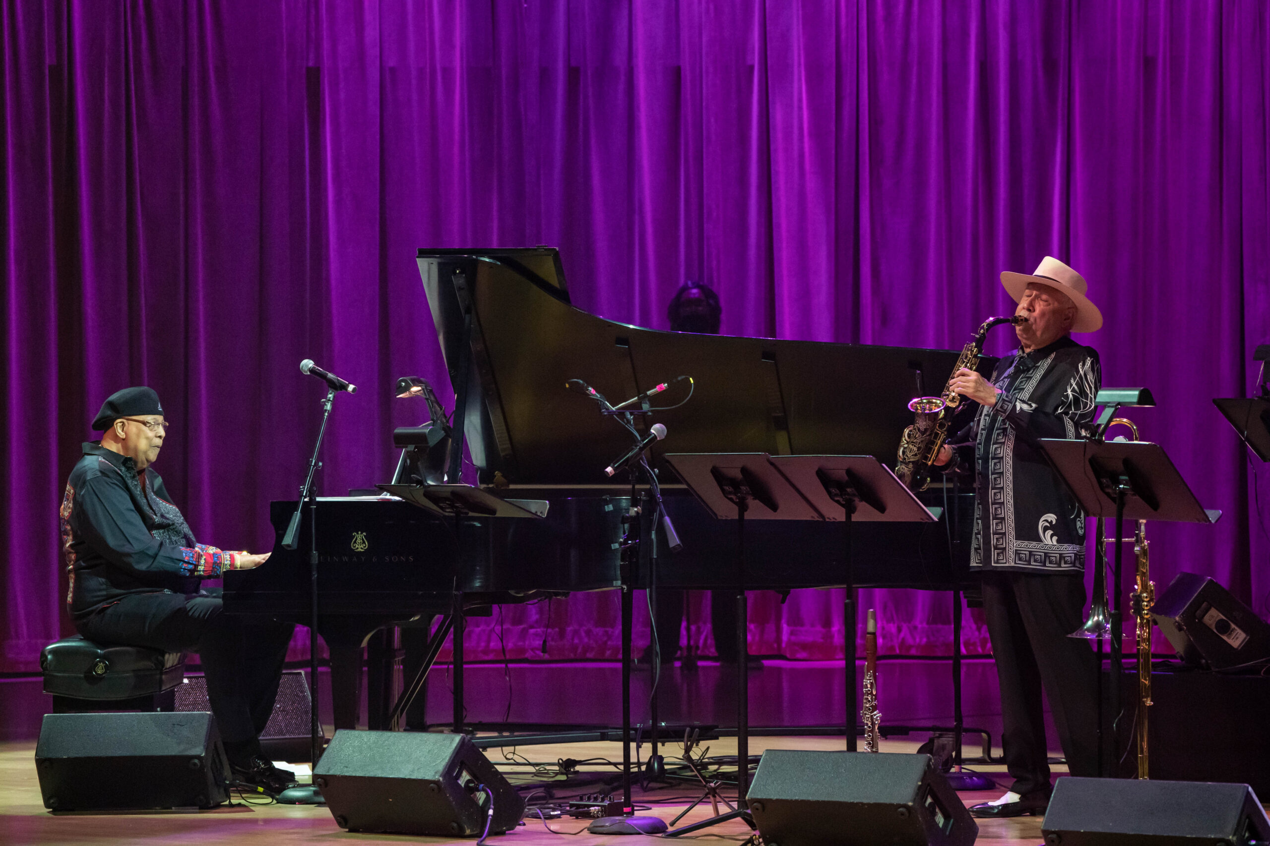 Chucho Valdés and saxophonist Paquito D’Rivera onstage at the Knight Concert Hall, co-headlining the June 2022 concert that heralded the end of a four-decade professional and personal separation. Now they are back joined for a celebration of the 50th anniversary of Irakere. (Photo by Daniel Azoulay/courtesy of the Adrienne Arsht Center)