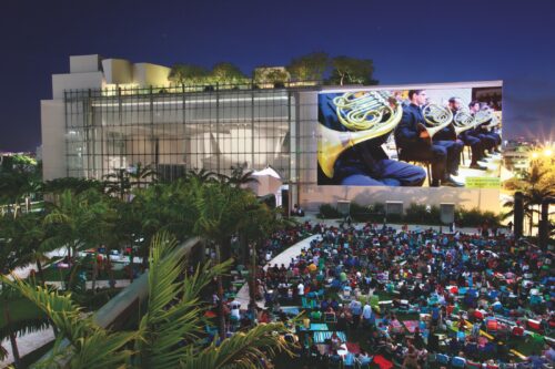New World Symphony Wallcast concert. Inside, Fellows perform; outside, Soundscape Park becomes a public square where Miami gathers around music. (Photo by WorldRedEye, courtesy of New World Symphony)