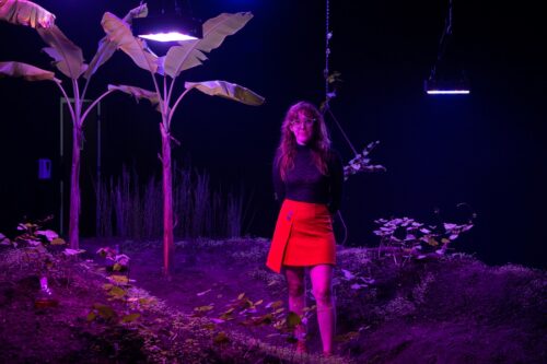 Visitors enter through a black curtain that separates the front of the exhibition area and the main space. Mounds and mounds of dirt (21 square yards, to be exact) act as the foundation for plants in what resembles a grow house. There’s much to take in. The centerpiece is a gold-fed garden that uses a reverse-engineering process to irrigate Florida native plants with a diluted gold solution.