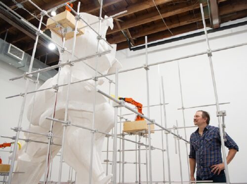 Open the door to the room of vivid white walls and see a bright-white, 8-foot-tall sculpture that consumes the space. The sculpture is “protected” by aluminum rods, while automated robot arms with small brushes attached continually clean it. At the bottom, a large tray is continually filled with water, a commentary on the impact of rising sea levels on Miami and its people.