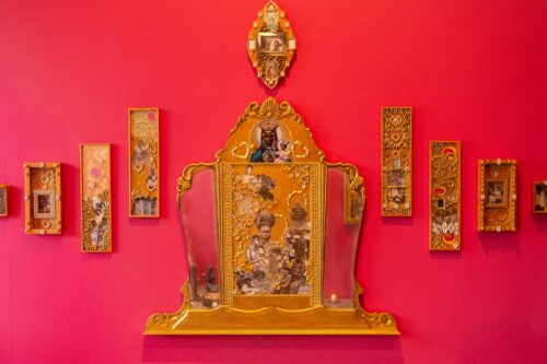 Johnson’s “Remnants” appears first inside the gallery, tucked in what is known as the Mobile Studio, a storefront area to the right of Locust Projects’ main lobby. The area has been painted two shades of pink for Johnson’s exhibition — colors the artist remembers from her grandmother’s home. There are intricate wall hangings and Santeria-inspired altars set up in the space, as well as collages where images of Black women and girls are embellished with shells, beads and gold jewelry.