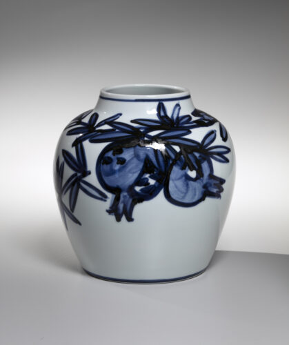 Pomegranate Cobalt-Blue Flower Vase, ca. 1960. Glazed porcelain with underglaze cobalt blue. 10 1/8 × 10 1/4 inches, copyright Kondo Yuzo. (Photo courtesy of Lowe Art Museum)