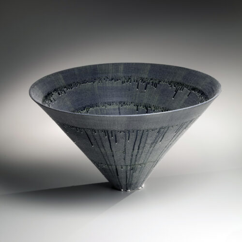Large bowl with “Silver Mist” Colors, 2018. Glazed porcelain with blue cobalt pigment and “silver mist.”3 1/4 × 6 7/8 inches, copyright Kondo Takahiro. (Photo courtesy of Lowe Art Museum)