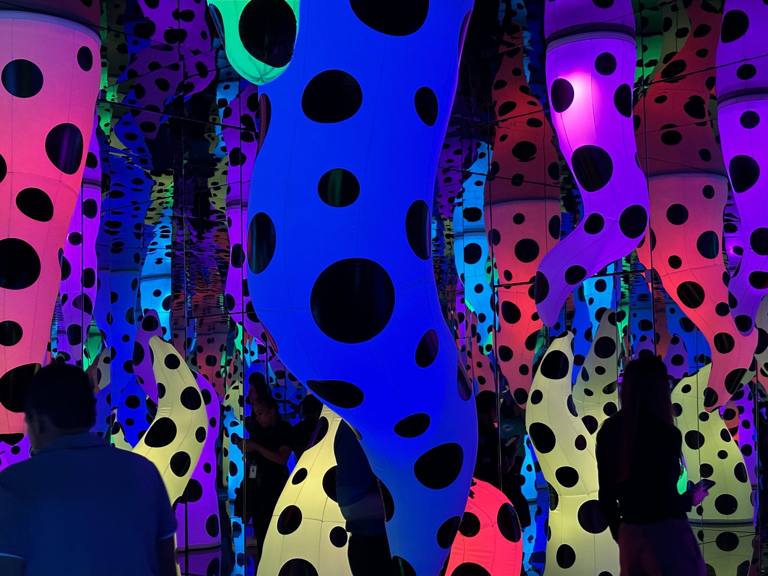 The room is covered with mirrors and brightly illuminated tentacles in blue, pink, purple, and yellow with black polka dots. The lights change and the kaleidoscopic effect of the mirrors makes the space multiply into infinite lights, colors, and shadows. The human shape of the viewer dissolves in the space and becomes part of the whole exhibit.