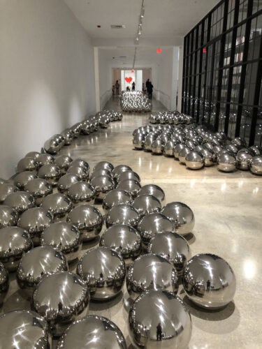 “Narcissus Garden,” at the Rubell Museum, was presented by Yoyoi Kusama as guerrilla art at the Venice Biennale in 1966, when she placed 1,500 mirrored balls covering a section of green lawn. (Photo courtesy of Douglas Gómez Barrueta)