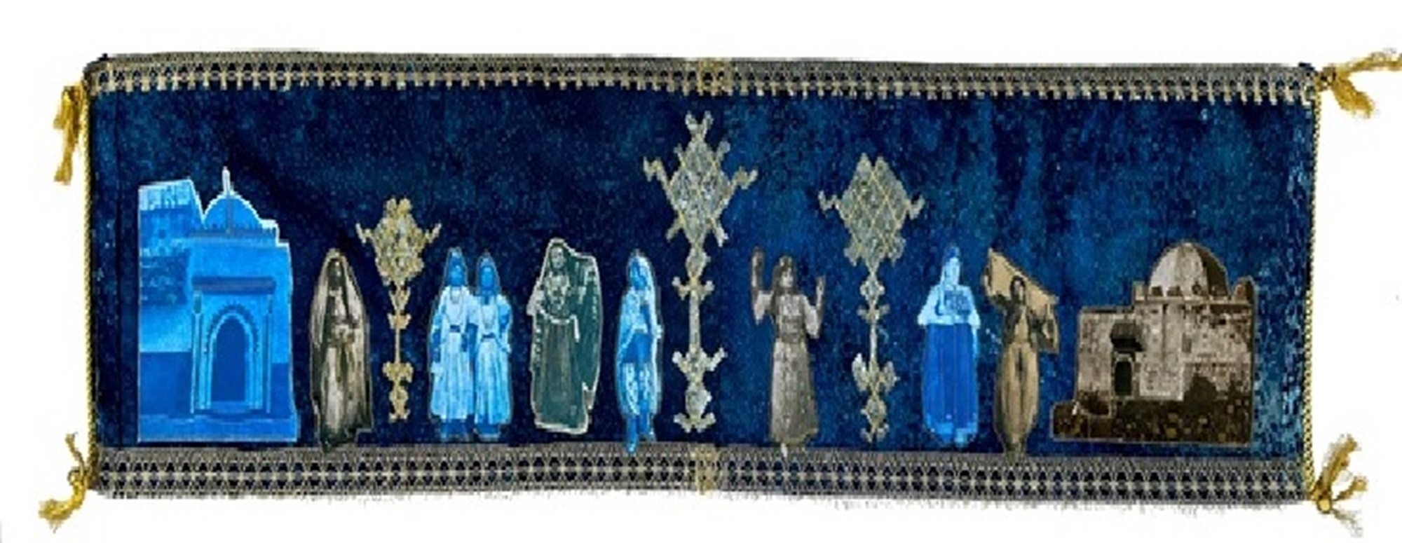 Fruma Markowitz, who lives and works in Bridgeport, Conn., for example, features Jewish, Berber and Muslim women sharing different stories – the message is that women, no matter where they are from do not have a problem recognizing one another’s humanity,” says Prapopoulos. The piece. titled “Hilloulah to the West and to the East – A Prayer for Peace,” references a 2020 trip to Morocco. There Markowitz learned about the friendships among these women from different backgrounds who share narratives, myths, religious beliefs, personal adornment and handcraft design, according to Markowitz’s artwork statement.