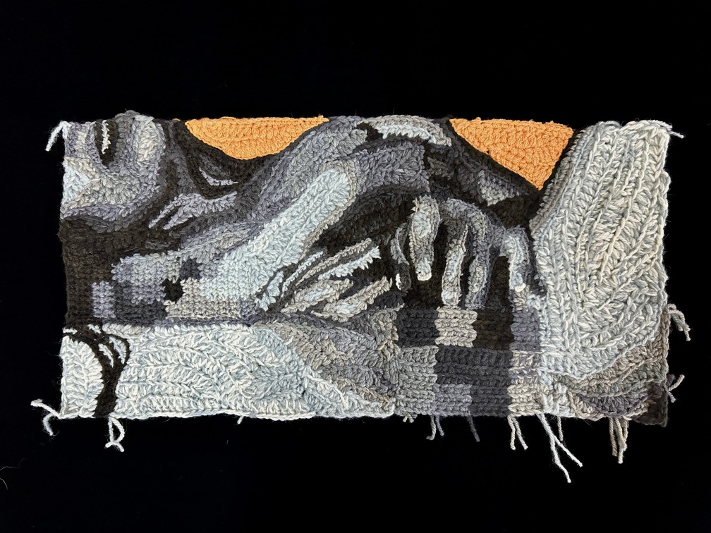 The approach taken by Katika, who currently resides in Russia, is direct, humorous, and engages with modern life. Part of her crochet tryptic, “The Power of Handiwork I, II, III” shows a woman masturbating – but the artist created a sly commentary on contemporary internet culture with a “blurred” effect crocheted over the most intimate parts.