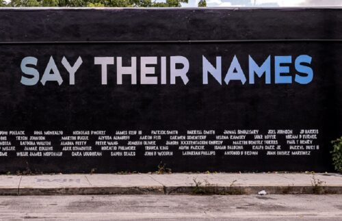 Her public art memorial project, “Say Their Names,” on the west-facing wall along Northwest Sixth Avenue attracted the attention of passersby who watched as she painted the names of people lost to hate crimes and gun, police, gender and domestic violence.