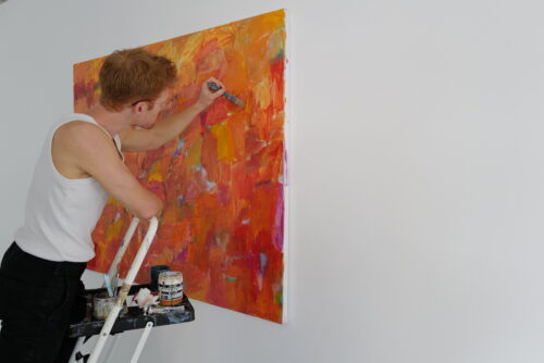 Through his process, the artist creates a sense of tension between order and chaos, structure and fluidity, which allows viewers to explore the painting’s complexities and dynamics. Ultimately, his work encourages viewers to connect with their own experiences and emotions and to explore the ways in which these are reflected in the art they encounter.