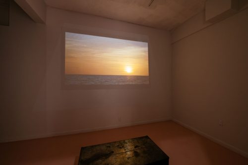 Two small alcove rooms frame the upstairs gallery space, one facing east and the other west. Inside the western-facing alcove, a video projection captures a Gulf Coast sunset, the sun inching below the horizon, framed by vast sky and choppy waves.
