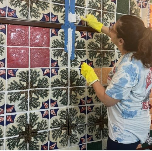 Artist Enma Saiz glazing part of the “Deering Tiles” installation. (Photo by Sofia Yaziji/courtesy of the artist)