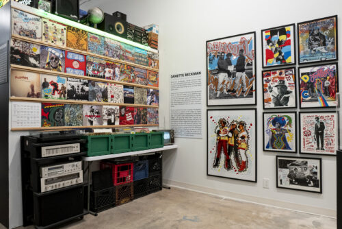 Interactive vinyl wall, left, and works of photographer Janette Beckman, right, at The Art Of Hip Hop museum. (Photo courtesy of The Art of Hip Hop)