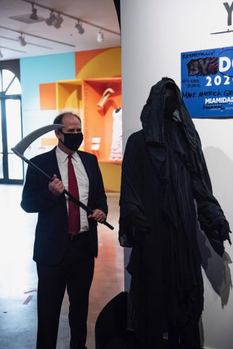 Attorney Daniel Uhlfelder stands next to the Grim Reaper costume he donated to “Collecting 2020.” (Photo courtesy of HistoryMiami Museum)