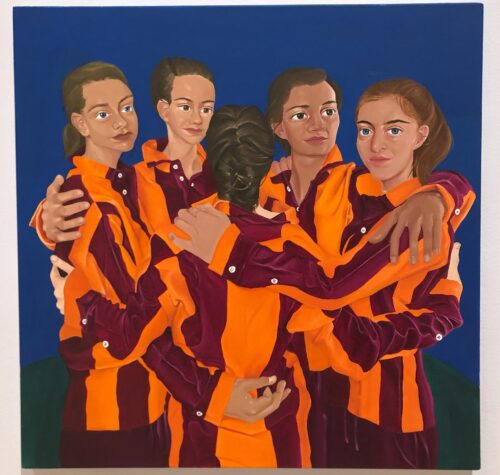 Some artists drew on art history. In her painting “Huddle,” American artist Fay Sanders shows a group of girls gathered in a team embrace. The artwork’s colors are designed to resemble Matisse’s famous painting “La Danse,” but Sanders has clothed her subjects, refuting the original painting’s male gaze. Monica Kim Garza, on the other hand, proudly deploys near-nudity in her paintings, in which the American of Mexican and Korean heritage depicts curvy, brown-skinned women reminiscent of Gaugin. Again, instead of objectifying her subjects as the male artist did with Tahitian natives, Kim Garza shows them enjoying their bodies free of shame, surfing and playing tennis and golf.