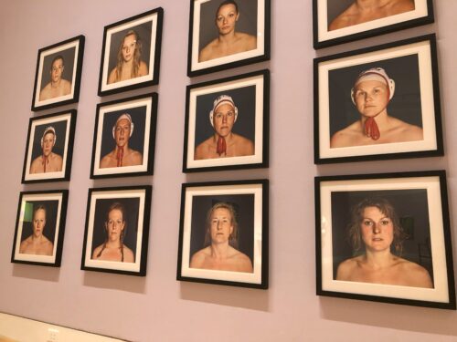 The idea that women can exist and thrive in spaces traditionally dominated by men is central to one of the largest works in the show, a series of 12 photo portraits by German artist Sophie Kirchner called “Male Sport.” Photographed dead-center in square frames, the photos show female athletes immediately after they’ve finished a match in one of three intensely physical sports: Hockey, water polo, and rugby. It’s a work that forces us to question what we expect when looking at women. Are power, strength, and toughness acceptable, or do we prefer beauty, meekness, the things that animate traditional ideas of femininity? Take a look for yourself and decide.