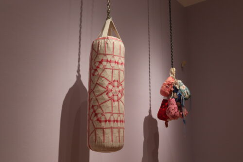 Zoe Buckman’s sculptures combine boxing equipment with fabric art, a medium traditionally regarded as feminine. (Photo by Douglas Markowitz)