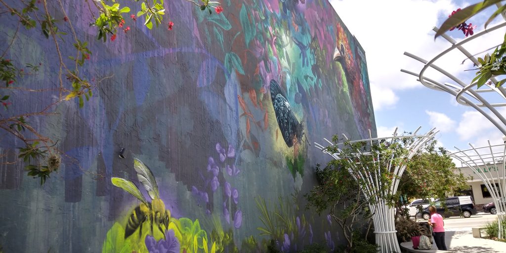 In addition to the stunning mural, the 2,700-square-foot public green space features expansive green wall, Florida-inspired landscape and decorative trellis with seating. (Photo courtesy of Jonel Juste)