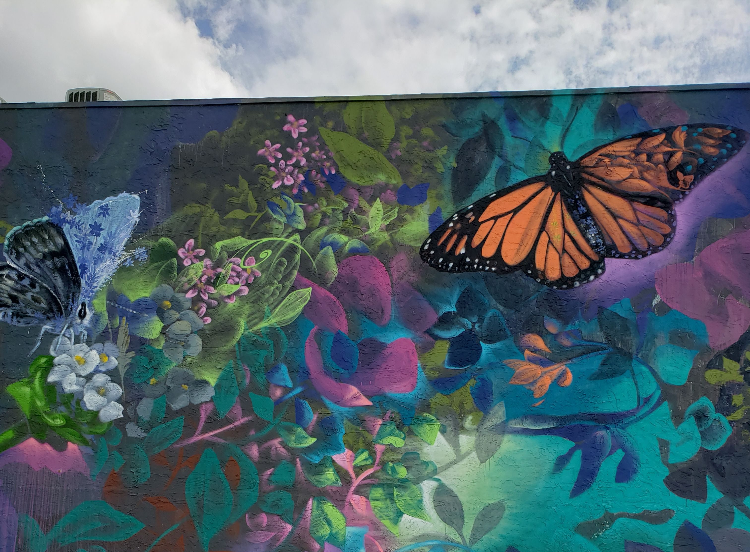 First, there’s the mural canvas on the east wall, measuring 95 feet wide x 45 feet high. A collaboration between the NMCRA and the nonprofit arts group, Before It’s Too Late, the mural touches on themes of restoring the native tree and plant habitats that nurture and allow birds, butterflies, bees, bats and other wildlife to thrive.