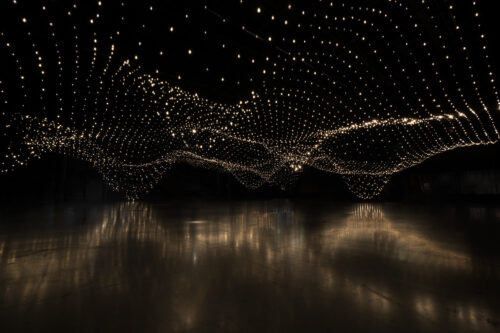 The Live Arts Miami-Superblue experience is set against the backdrop of Superblue’s “Pulse Topology” exhibit, an installation created by Mexican-Canadian artist Rafael Lozano-Hemmer known for his participatory installations. Consisting of 3,000 suspended light bulbs, Lozano-Hemmer’s works are activated by participants’ real-time biometric data such as their heartbeats, breaths, voices or fingerprints.