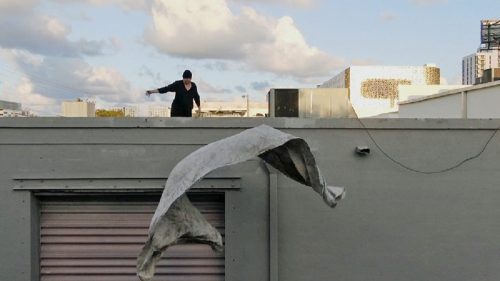 The canvases in “Made by Dusk,” perched on the gallery walls, show video projections of the Miami-based artist on the roof of the Locust Projects building throwing canvases off the sides and pulling canvases back up onto the roof.