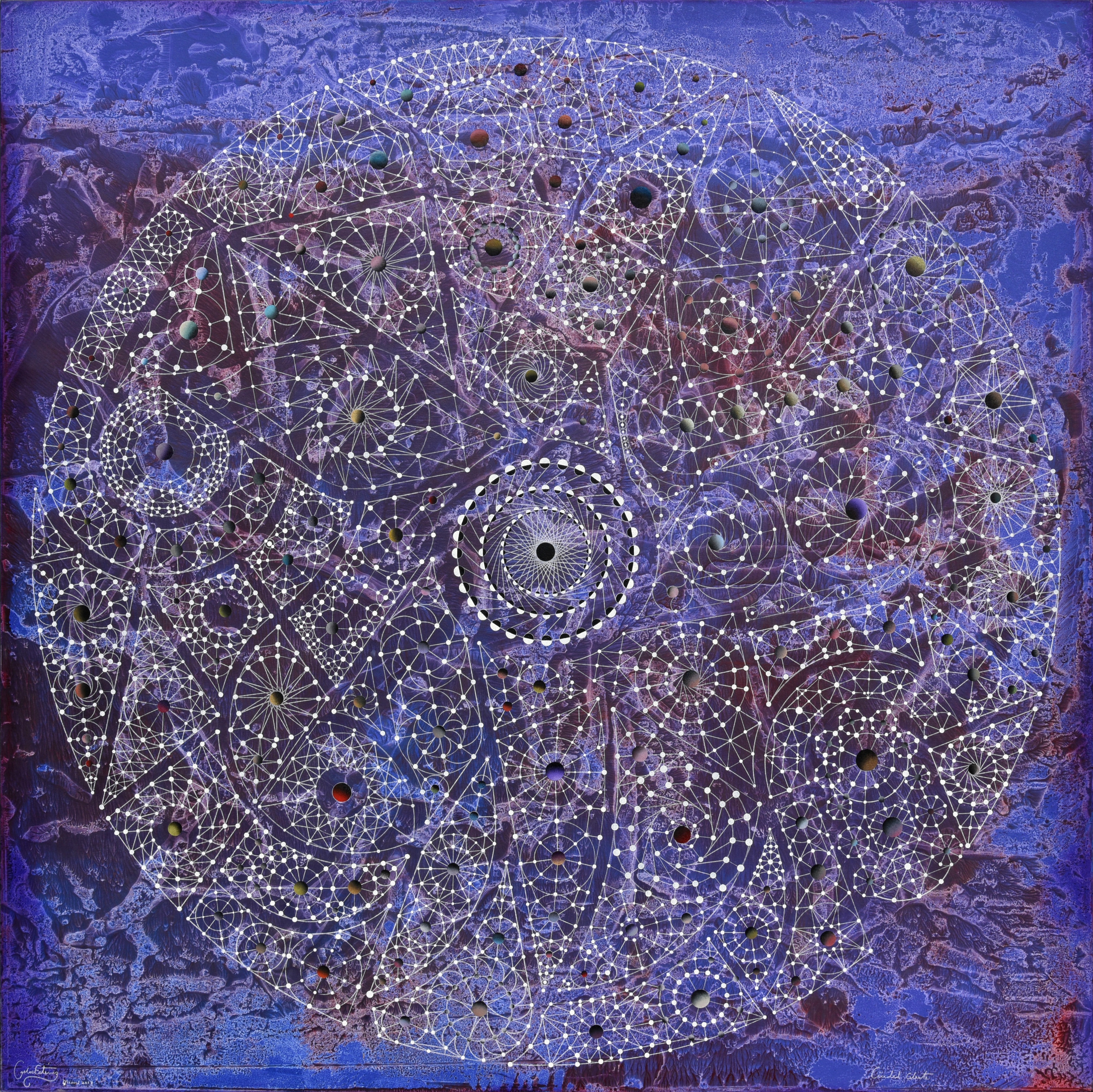 The lacy filigree of geometric patterns in “Celestial City” takes the eye on another circular journey, punctuated with multiple diagonal and curving pathways like avenues leading to a city center. They lead to the painting’s radiant heart, where concentric circles surround a piercing blue dot marking the midpoint of the canvas.