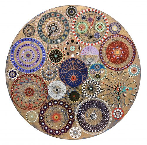 Animating “Inner Vision of the Outer Space” is a spirited composition with more than 20 circles, large and small. They are elaborately painted on a tondo, or round canvas, that’s 8 feet in diameter. It creates a movement for the eye that can be both dizzying and meditative, as the artist has transformed the singular medieval landmark of a singular city into a multi-tasking metaphor for the passage of time and ancient efforts to map starry constellations.