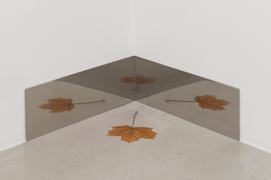 Hreinn Fridfinnsson’s “A leaf that fell to the ground and was picked up sometime in the early80s” (2015), features polished stainless steel, an autumn leaf and wood. (Photo courtesy of the artist)