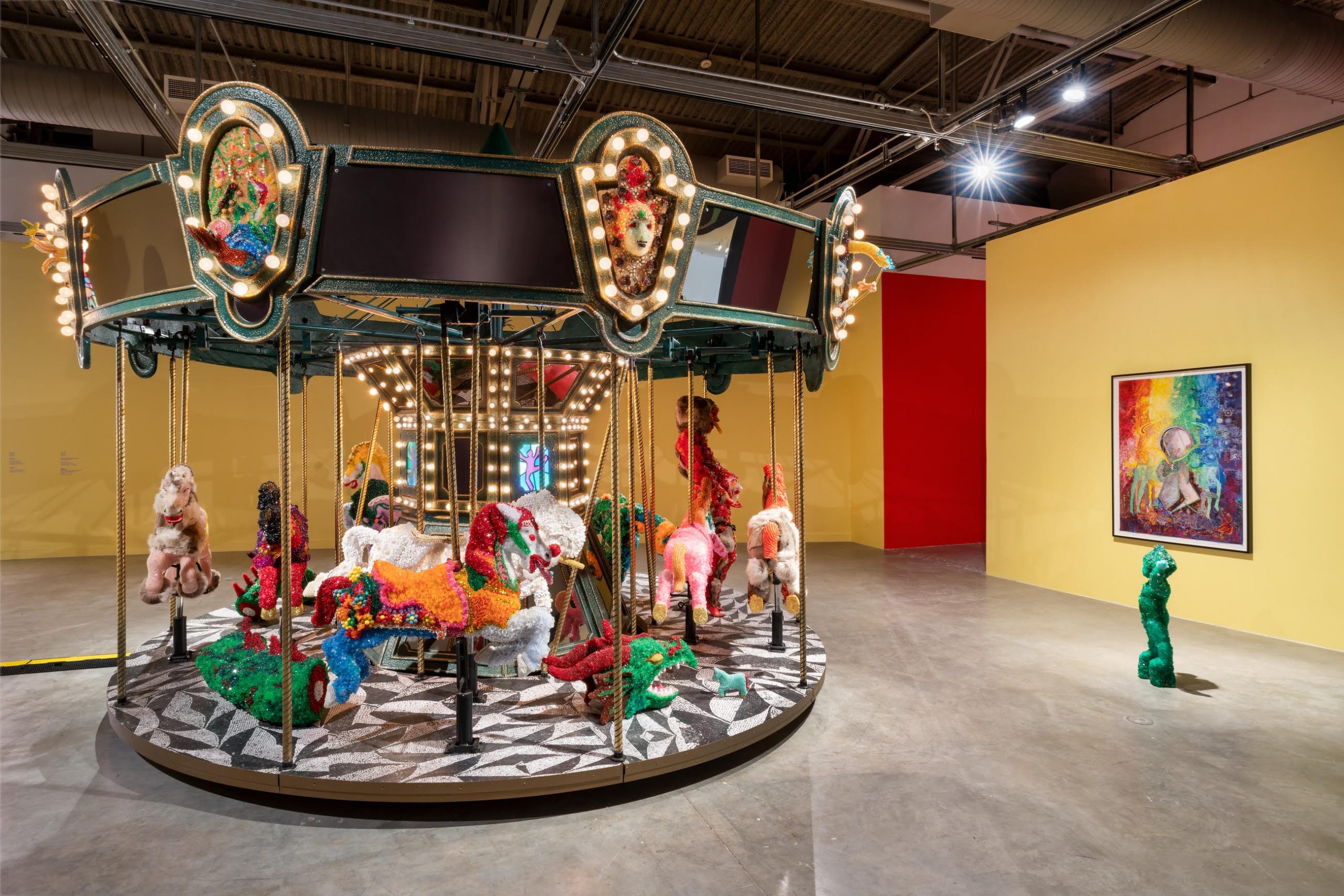 At the center of the “The Eternal Return and The Obsidian Heart” exhibition is a life-sized carousel that circles endlessly in a performance of fantasy and delirium. (Photo courtesy of MOCA North Miami)