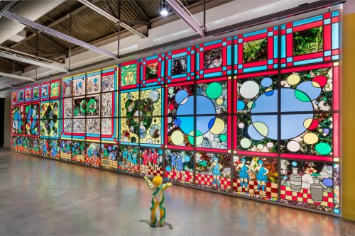The exhibit features a 14-foot-tall by 50-foot-wide installation titled “Basilio,” representing cosmic time with its depictions of planets circling the sun. There’s also a working carousel, referencing the cyclical time of Eternal Return, or “the idea that time is composed of a limited number of events that endlessly recur in different sequences and combinations,” according to the museum.