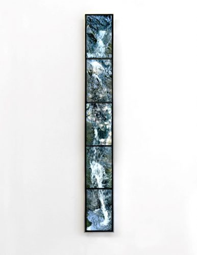 The five-panel vertical video display features a continuous cascading waterfall. The piece, which was captured near a meditation center, is deliberately devoid of sound.