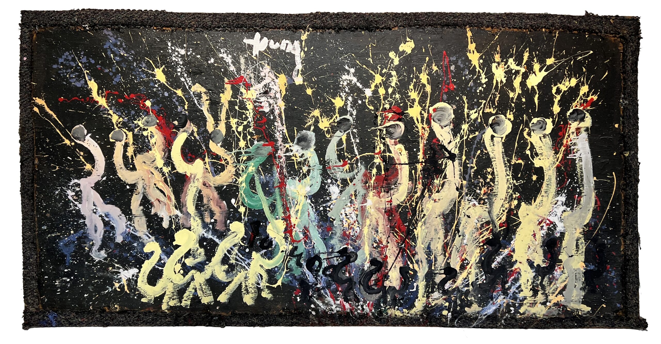 Purvis Young’s “My Respect to Pollock,” (undated), mixed media on wood. Pan American Art Projects presents “Purvis Young: A Visionary of Miami’s Cultural Identity,” an exhibition celebrating the profound legacy of Young, whose work left an enduring mark on Miami’s art history. (Photo courtesy of Pan American Art Projects)