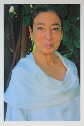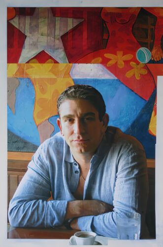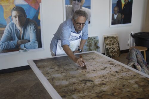 He developed a technique, he explains, where the portraits begin as photographs, then he enlarges them and prints them on up to 20 multiple sheets of archival 11 x 17-inch paper, using a large-scale high-resolution printer. He soaks the printouts in water and adheres them to canvas using a polymer resin, then he paints over the image with oil paint.