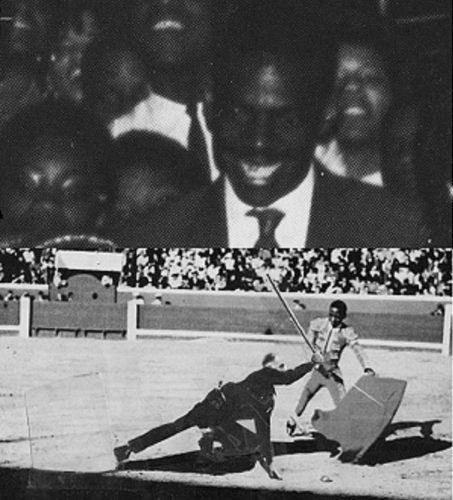 “I didn’t just want to put an image onto a wall. I wanted to make something that activated a spectacle,” Joseph says. “So now, the viewer looks up at the matador, and the man on the other side is also watching.”