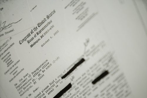 Directly across from “Maximum Security,” on the other curved wall, is the more recent “No Fly Security” (2018-2019), another assortment of documents and emails that includes the non-public roster of individuals prohibited from flying in and out of the United States on suspicion of terrorist ties. There are many emails from citizens asking why they were stopped at the airport. One, from an 84-year-old woman from Lexington, Ky., describes how she was detained at a Florida airport.