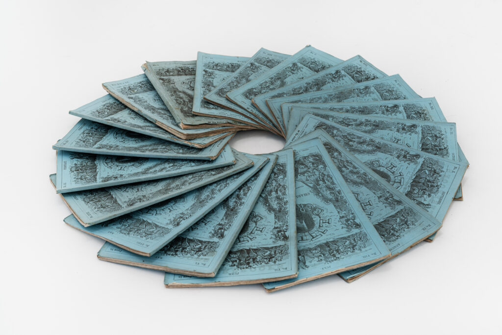In 1865, Charles Dickens released a “serial” paperback. The original 19 limited editions make up “Untitled (“Charles Dickens),” 2023. (Photo by Michael R. Lopez)