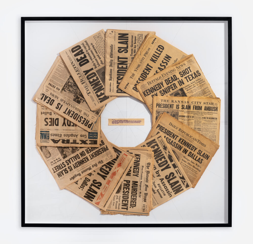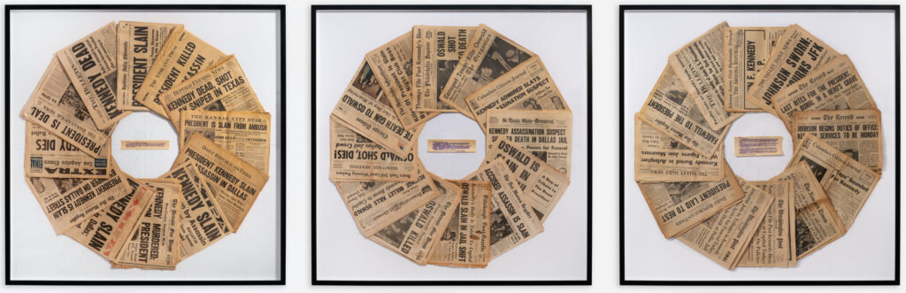 Scholl’s own memories bubble up as he stands in front of three large works that are a focal point of “The Melody Haunts My Reverie.” Completed in 2023, the triptych is made up of newspapers from a pivotal moment in American history. From the Kansas City Star to the New York Times circa 1963, the now yellowed newspapers, their front pages with bold headlines, are arranged in a dodecagon, a 12-sided figure that is a recurring motif in the artist’s work.”  The first is “Untitled (Assassination),” the second is “Untitled (Oswald),” the third, “Untitled  (Mourning).”