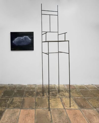 Palazzolo-Daboul created an installation composed of a painting, and a sculpture titled “A Barrier Falls Between the World and Me,” consisting of an oversized chair sculpture and a painting of a cloud. “There was a particular thing that Gertrude Stein said about liking a good view but liking to sit with her back facing it. This idea of duality, of having the options to do something and still not choosing to do so,” explains the artist, who was born in Mar del Plata, Buenos Aires, Argentina, and now lives and works in Miami.